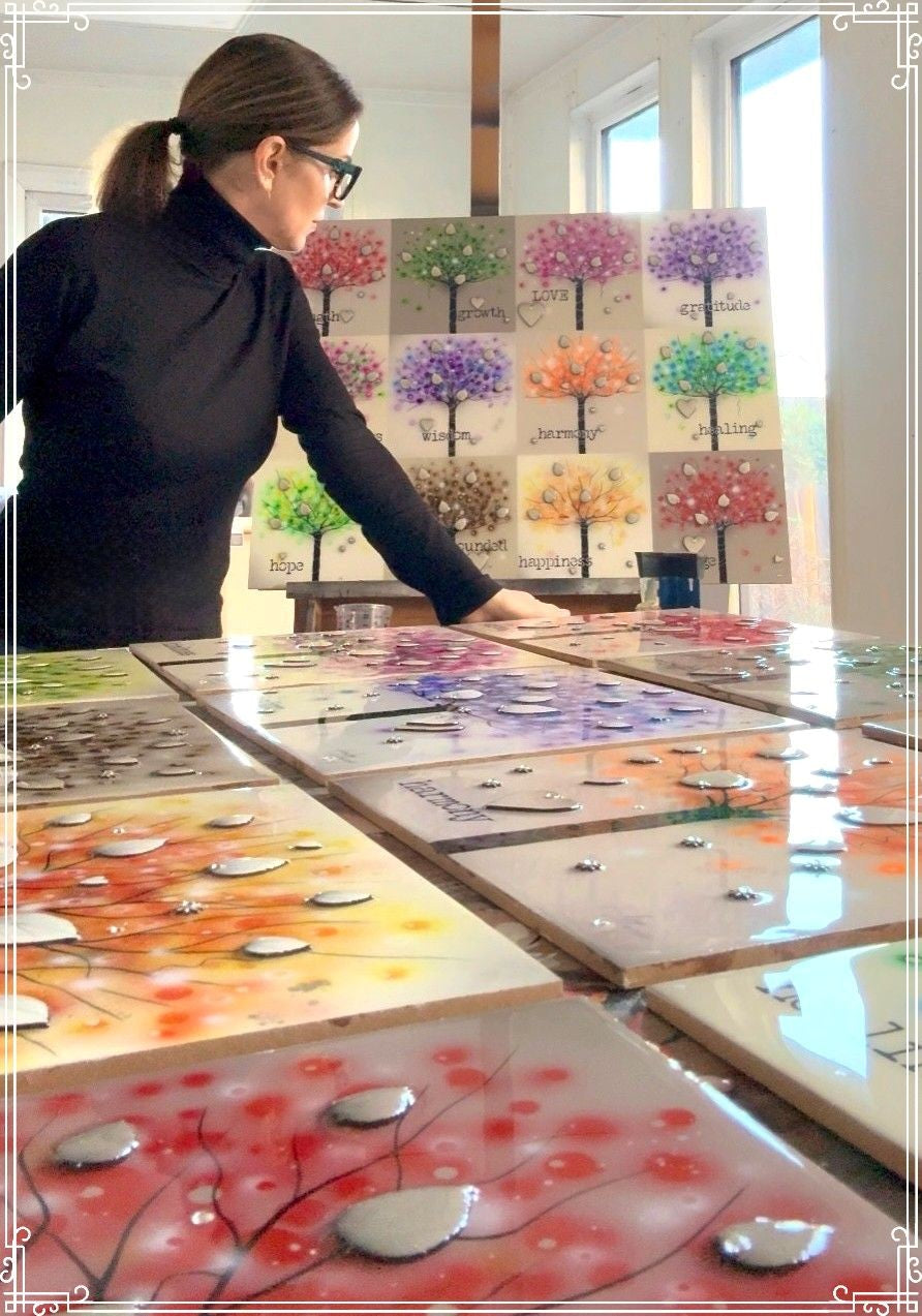Floated, Deckled Edge embellished print with 3D resin coated glass elements. Both paper and glass embellishments are unique & carried out by the artist individually.